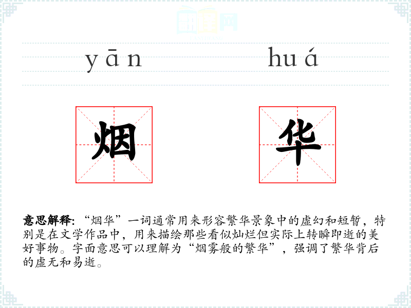 “烟华”一词通常用来形容繁华景象中的虚幻和短暂,特别是在文学作品中,用来描绘那些看似灿烂但实际上转瞬即逝的美好事物。字面意思可以理解为“烟雾般的繁华”,强调了繁华背后的虚无和易逝。