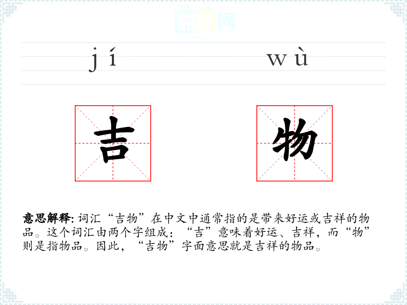 词汇“吉物”在中文中通常指的是带来好运或吉祥的物品。这个词汇由两个字组成:“吉”意味着好运、吉祥,而“物”则是指物品。因此,“吉物”字面意思就是吉祥的物品。