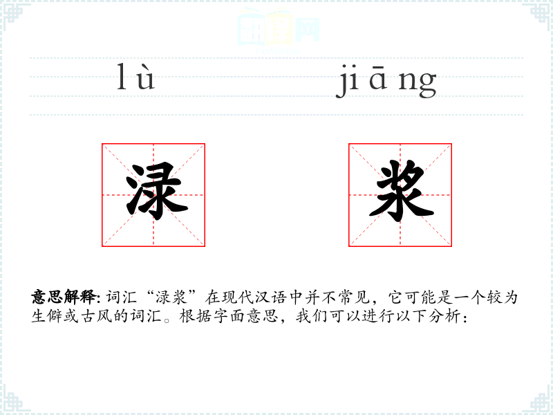 词汇“渌浆”在现代汉语中并不常见,它可能是一个较为生僻或古风的词汇。根据字面意思,我们可以进行以下分析: