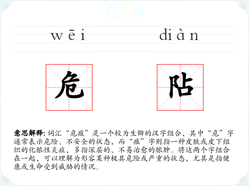 - 演变:随着语言的发展,“危疽”这个组合词汇逐渐被用来形容那些极其危险或严重的疾病状态。
