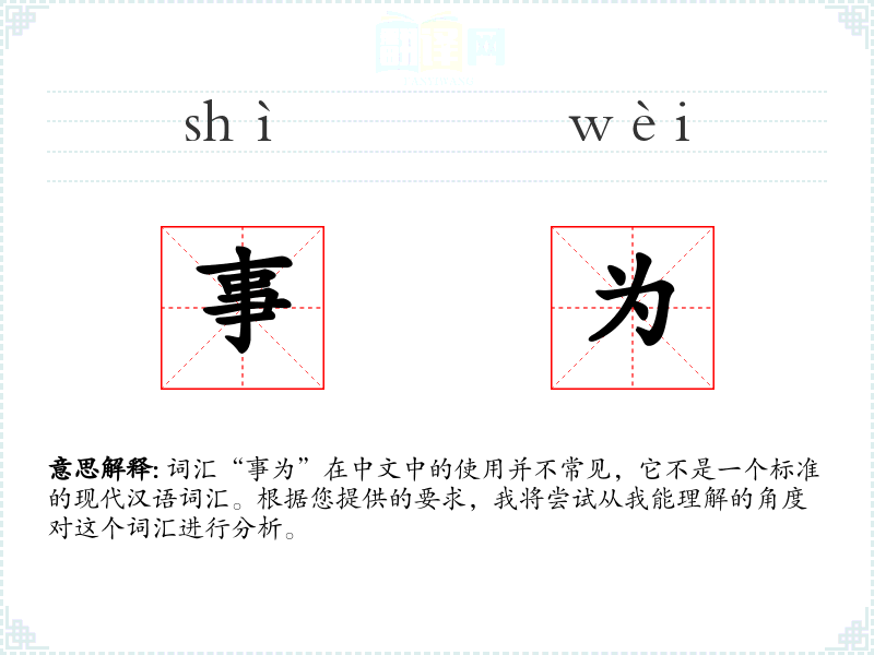 由于“事为”不是一个标准的现代汉语词汇,它的字面意思和基本含义并不明确。在古汉语中,“事”通常指事情、事务,而“为”可以表示做、作为。因此,从字面上看,“事为”可能指的是处理事务或作为某种行为。