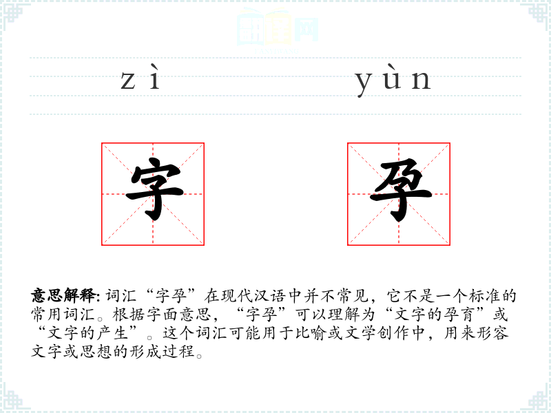 “字孕”字面意思是指文字的孕育或产生。在文学或创意写作中,它可能用来形容一个想法或故事的萌芽和发展。