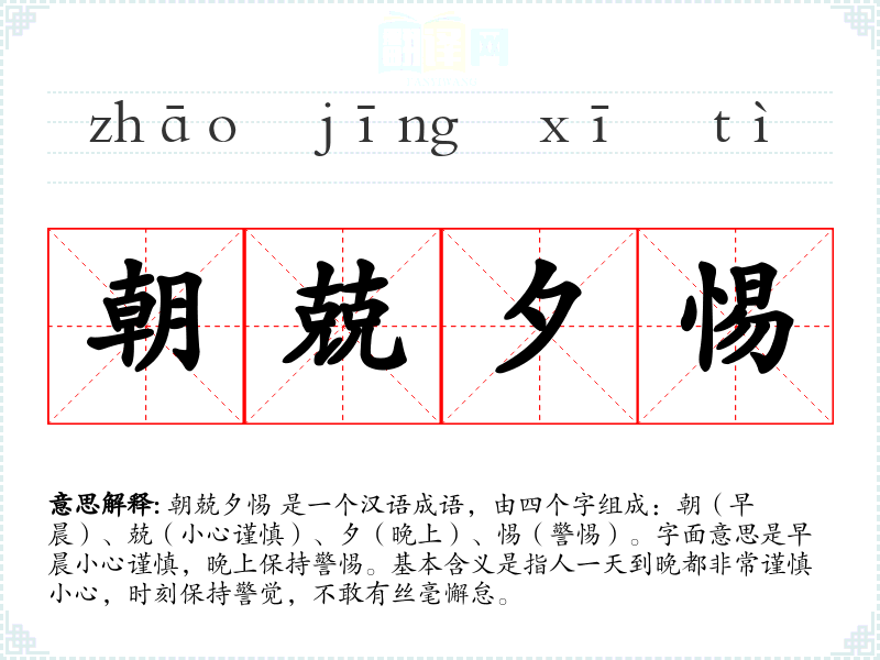 朝兢夕惕 是一个汉语成语,由四个字组成:朝(早晨)、兢(小心谨慎)、夕(晚上)、惕(警惕)。字面意思是早晨小心谨慎,晚上保持警惕。基本含义是指人一天到晚都非常谨慎小心,时刻保持警觉,不敢有丝毫懈怠。