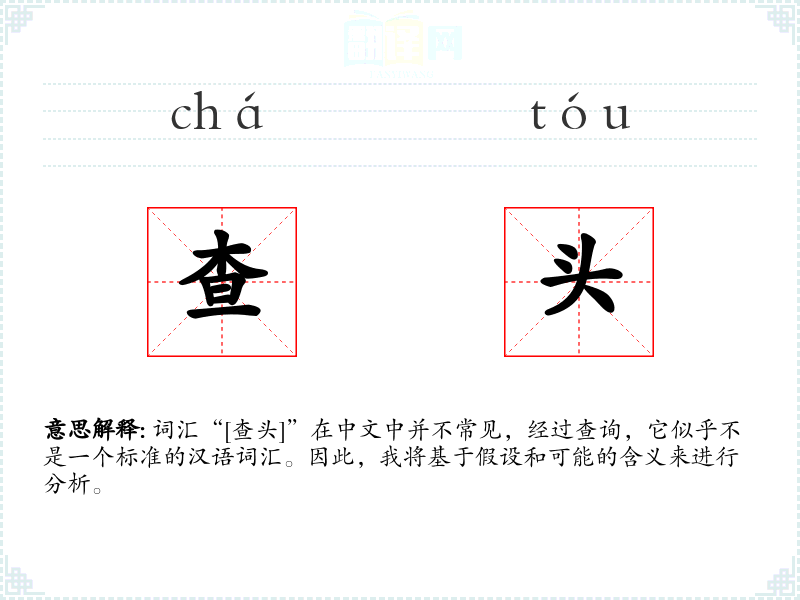 词汇“[查头]”在中文中并不常见,经过查询,它似乎不是一个标准的汉语词汇。因此,我将基于假设和可能的含义来进行分析。
