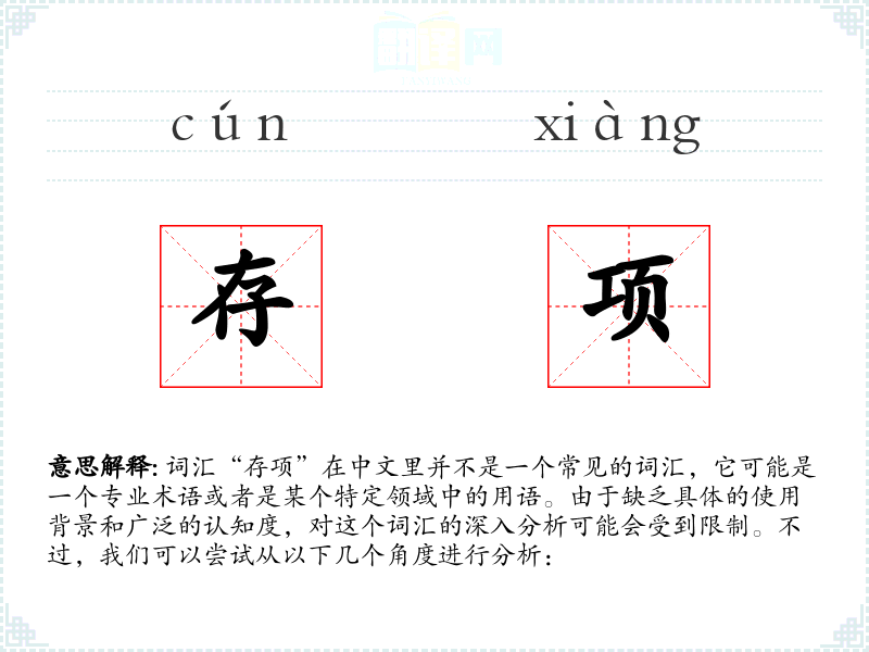 词汇“存项”在中文里并不是一个常见的词汇,它可能是一个专业术语或者是某个特定领域中的用语。由于缺乏具体的使用背景和广泛的认知度,对这个词汇的深入分析可能会受到限制。不过,我们可以尝试从以下几个角度进行分析:
