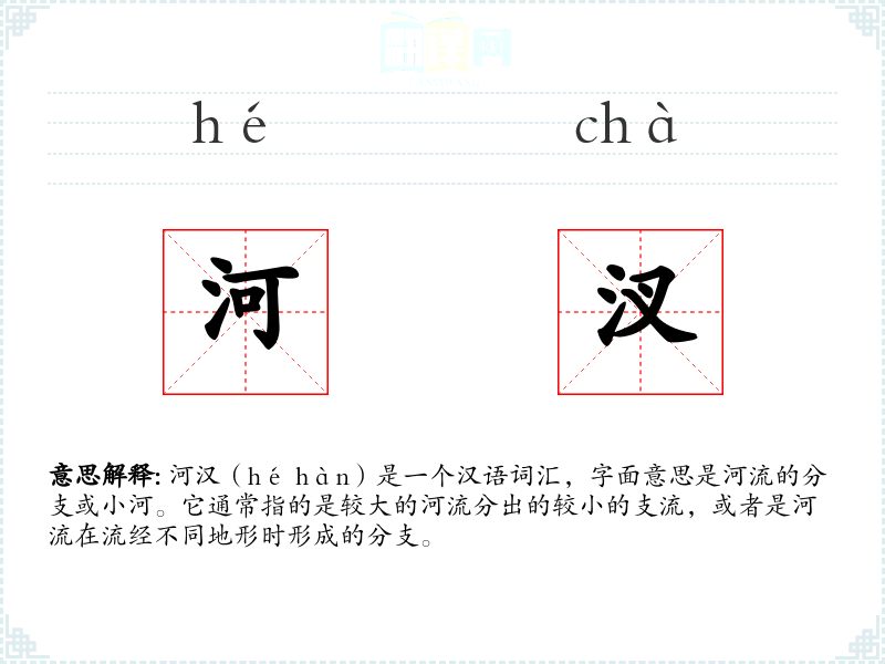 河汉(hé hàn)是一个汉语词汇,字面意思是河流的分支或小河。它通常指的是较大的河流分出的较小的支流,或者是河流在流经不同地形时形成的分支。