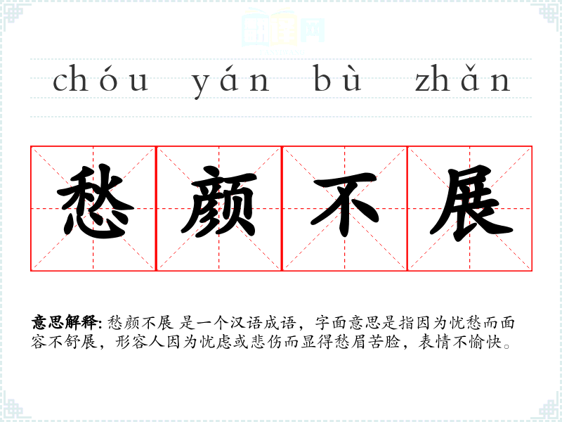愁颜不展 是一个汉语成语,字面意思是指因为忧愁而面容不舒展,形容人因为忧虑或悲伤而显得愁眉苦脸,表情不愉快。