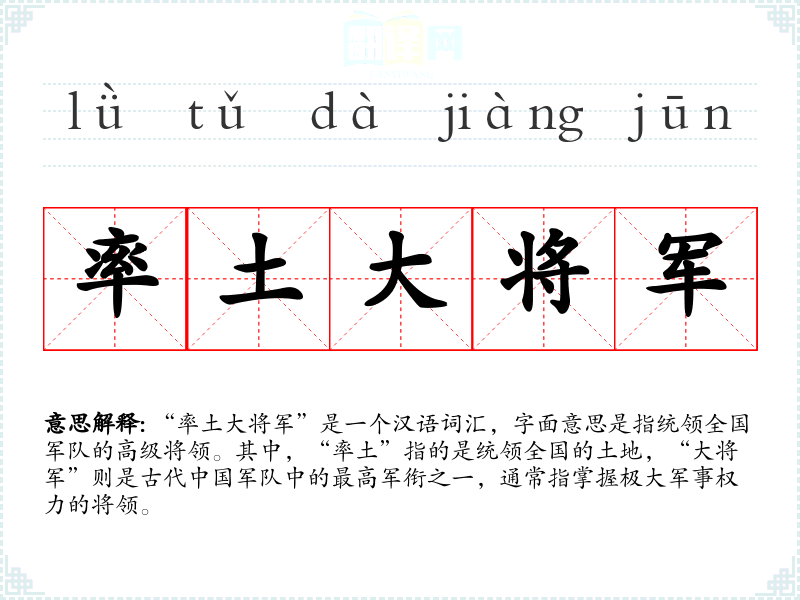 “率土大将军”是一个汉语词汇,字面意思是指统领全国军队的高级将领。其中,“率土”指的是统领全国的土地,“大将军”则是古代**军队中的最高军衔之一,通常指掌握极大军事权力的将领。