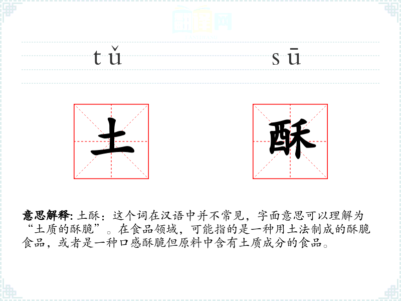 土酥:这个词在汉语中并不常见,字面意思可以理解为“土质的酥脆”。在食品领域,可能指的是一种用土法制成的酥脆食品,或者是一种口感酥脆但原料中含有土质成分的食品。