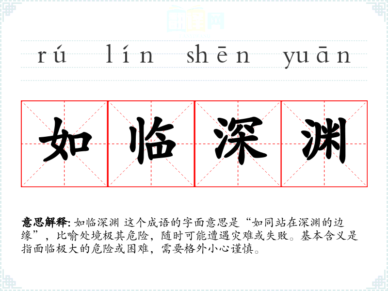 如临深渊 这个成语的字面意思是“如同站在深渊的边缘”,比喻处境极其危险,随时可能遭遇灾难或失败。基本含义是指面临极大的危险或困难,需要格外小心谨慎。