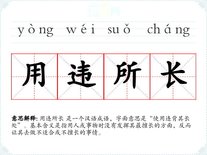 用违所长 是一个汉语成语,字面意思是“使用违背其长处”。基本含义是指用人或事物时没有发挥其最擅长的方面,反而让其去做不适合或不擅长的事情。