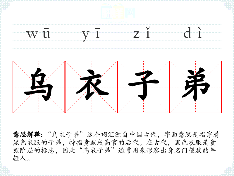 “乌衣子弟”这个词汇源自**古代,字面意思是指穿着黑色衣服的子弟,特指贵族或高官的后代。在古代,黑色衣服是贵族阶层的标志,因此“乌衣子弟”通常用来形容出身名门望族的年轻人。
