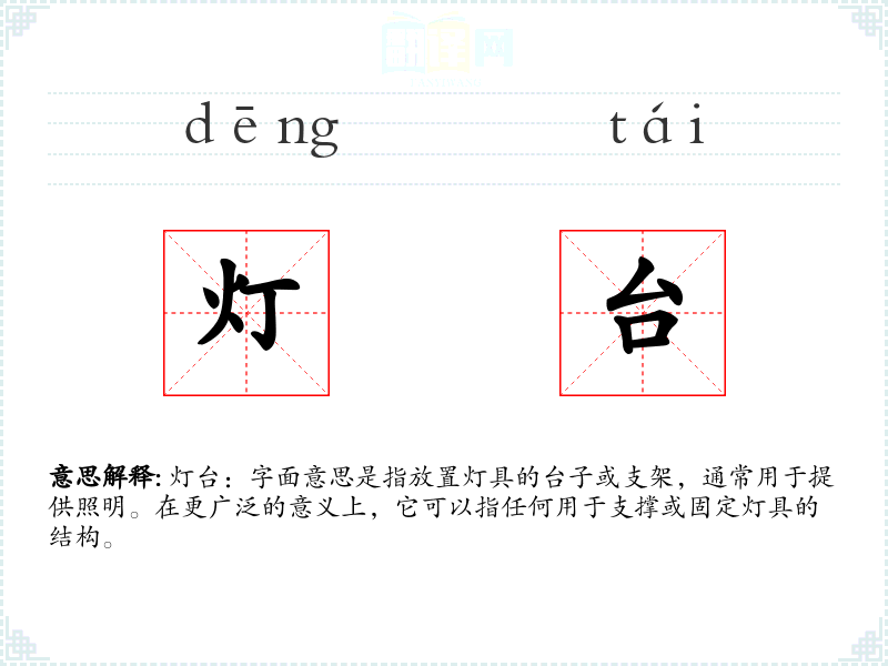 灯台:字面意思是指放置灯具的台子或支架,通常用于提供照明。在更广泛的意义上,它可以指任何用于支撑或固定灯具的结构。