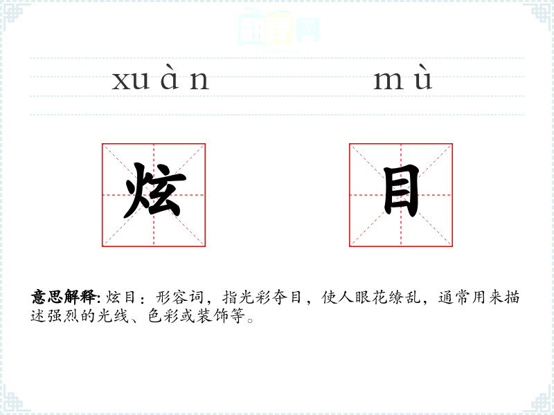 炫目:形容词,指光彩夺目,使人眼花缭乱,通常用来描述强烈的光线、色彩或装饰等。