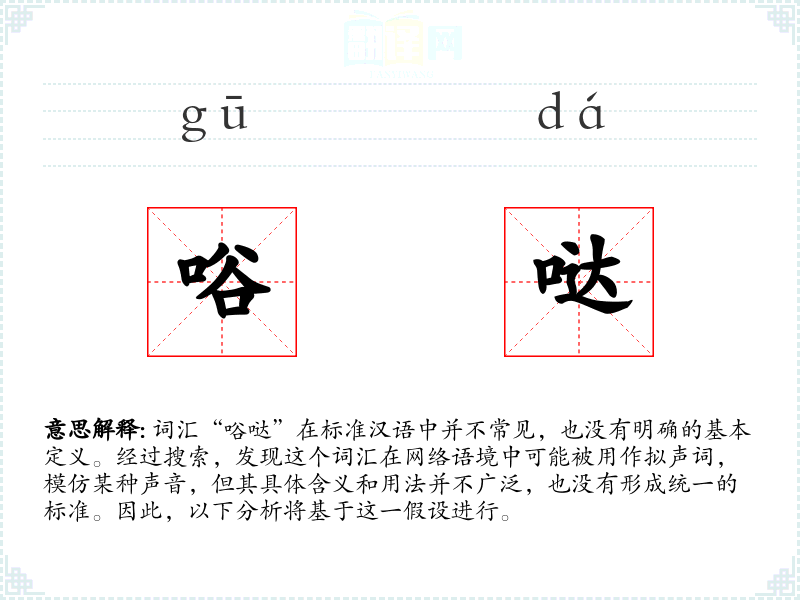 词汇“唂哒”在标准汉语中并不常见,也没有明确的基本定义。经过搜索,发现这个词汇在网络语境中可能被用作拟声词,模仿某种声音,但其具体含义和用法并不广泛,也没有形成统一的标准。因此,以下分析将基于这一假设进行。