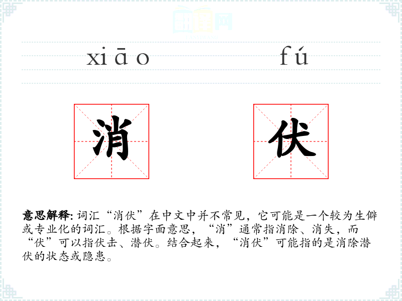 词汇“消伏”在中文中并不常见,它可能是一个较为生僻或专业化的词汇。根据字面意思,“消”通常指消除、消失,而“伏”可以指伏击、潜伏。结合起来,“消伏”可能指的是消除潜伏的状态或隐患。