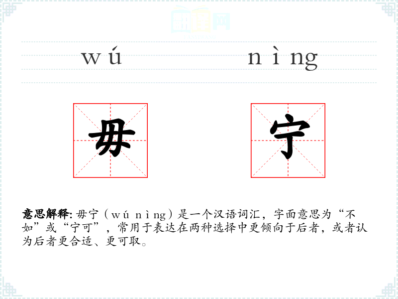 毋宁(wú nìng)是一个汉语词汇,字面意思为“不如”或“宁可”,常用于表达在两种选择中更倾向于后者,或者认为后者更合适、更可取。