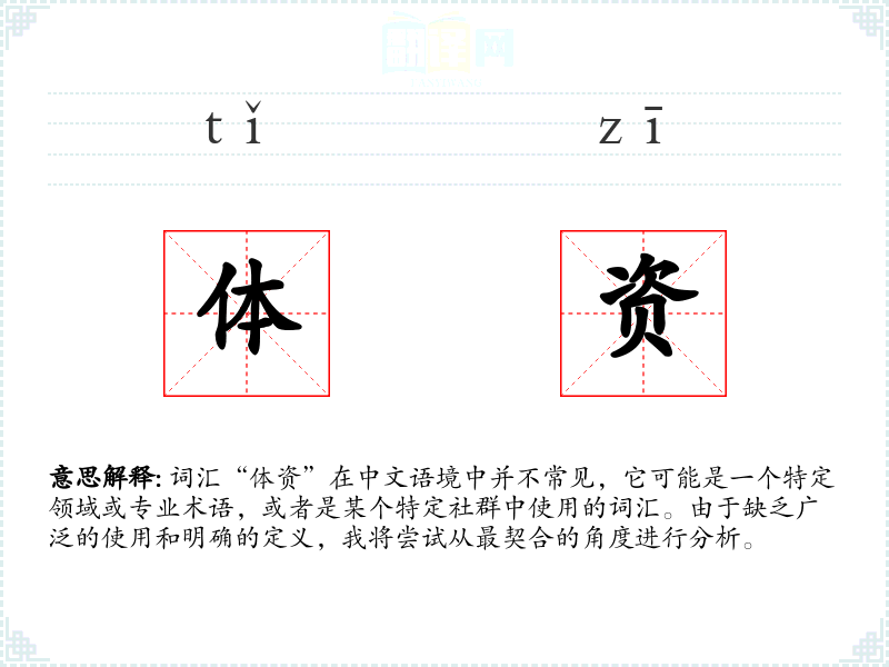 词汇“体资”在中文语境中并不常见,它可能是一个特定领域或专业术语,或者是某个特定社群中使用的词汇。由于缺乏广泛的使用和明确的定义,我将尝试从最契合的角度进行分析。