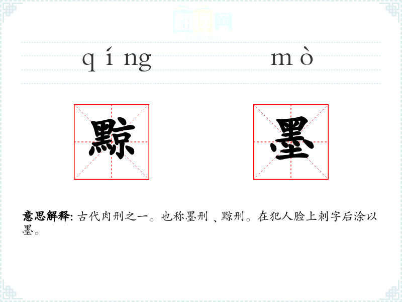 古代肉刑之一。也称墨刑﹑黥刑。在犯人脸上刺字后涂以墨。