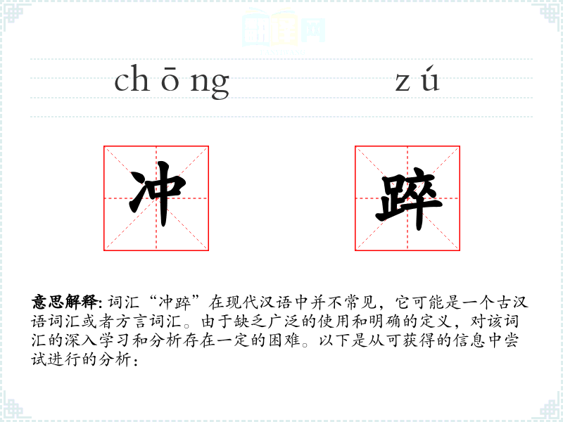“冲踤”作为一个不常见的词汇,其学习和分析存在一定的挑战。它可能源自古代汉语,带有强烈的冲击意味,但在现代汉语中几乎不使用。了解这样的词汇可以增加对语言多样性和历史演变的认识,但在实际语言运用中,更倾向于使用更常见和明确的词汇。