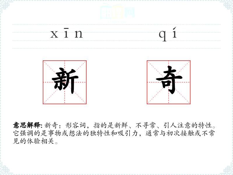 新奇:形容词,指的是新鲜、不寻常、引人注意的特性。它强调的是事物或想法的独特性和吸引力,通常与初次接触或不常见的体验相关。