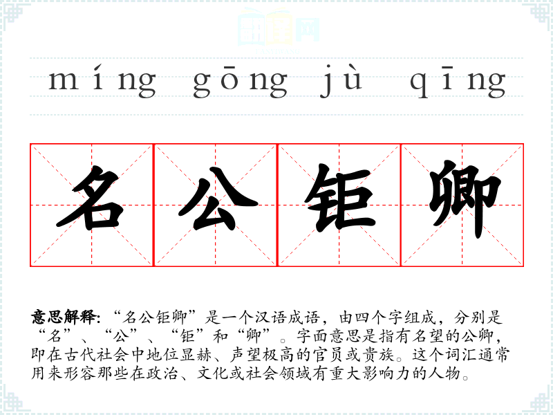 “名公钜卿”是一个汉语成语,由四个字组成,分别是“名”、“公”、“钜”和“卿”。字面意思是指有名望的公卿,即在古代社会中地位显赫、声望极高的官员或贵族。这个词汇通常用来形容那些在政治、文化或社会领域有重大影响力的人物。