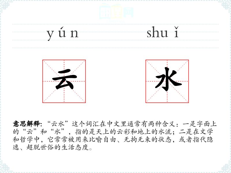 “云水”这个词汇在中文中具有丰富的文化内涵和情感联想,它不仅是自然景观的描述,也是人们追求自由和内心平静的象征。在我的语言学*和表达中,理解和运用“云水”这个词,可以帮助我更好地表达自己的情感和思想。