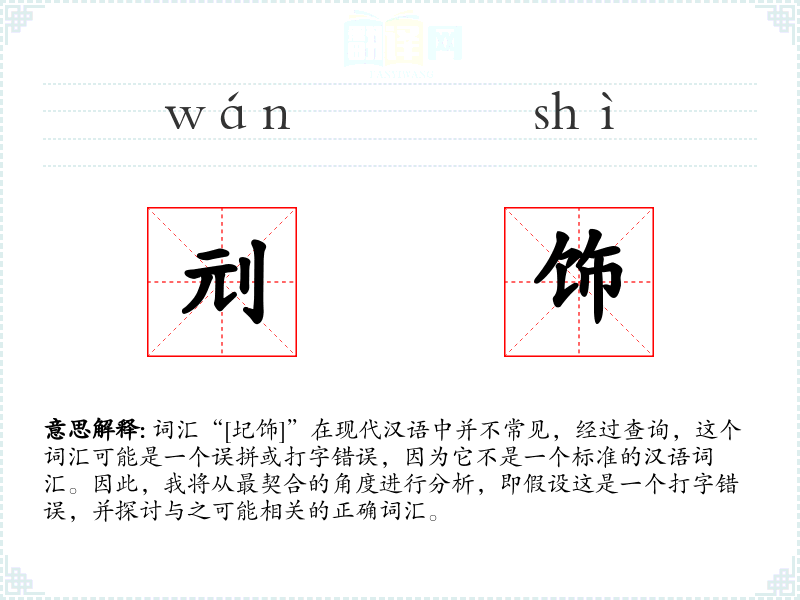 词汇“[圮饰]”在现代汉语中并不常见,经过查询,这个词汇可能是一个误拼或打字错误,因为它不是一个标准的汉语词汇。因此,我将从最契合的角度进行分析,即假设这是一个打字错误,并探讨与之可能相关的正确词汇。
