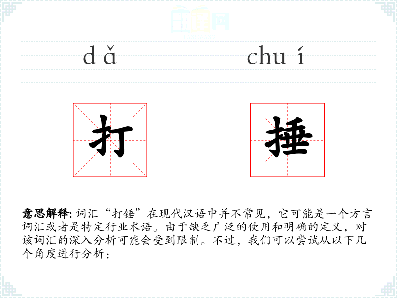 同义词可能包括“敲打”、“锤击”等,反义词则可能没有明确的对应词汇,因为“打锤”本身不是一个常用词汇。