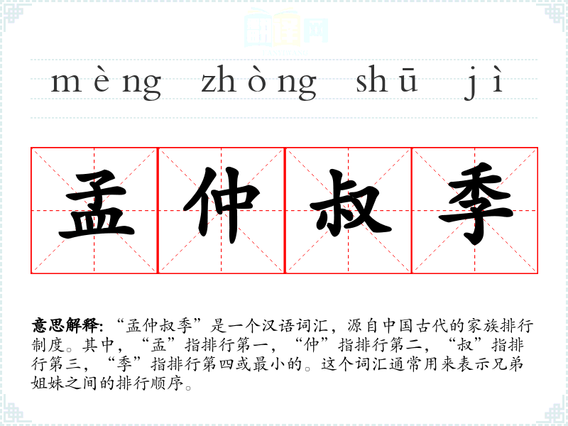 “孟仲叔季”是一个汉语词汇,源自**古代的家族排行制度。其中,“孟”指排行第一,“仲”指排行第二,“叔”指排行第三,“季”指排行第四或最小的。这个词汇通常用来表示兄弟姐妹之间的排行顺序。