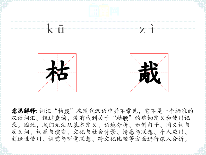词汇“枯骾”在现代汉语中并不常见,它不是一个标准的汉语词汇。经过查询,没有找到关于“枯骾”的确切定义和使用记录。因此,我们无法从基本定义、语境分析、示例句子、同义词与反义词、词源与演变、文化与社会背景、情感与联想、个人应用、创造性使用、视觉与听觉联想、跨文化比较等方面进行深入分析。