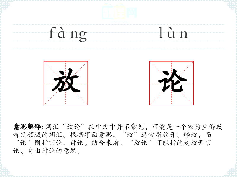 词汇“放论”在中文中并不常见,可能是一个较为生僻或特定领域的词汇。根据字面意思,“放”通常指放开、释放,而“论”则指言论、讨论。结合来看,“放论”可能指的是放开言论、自由讨论的意思。