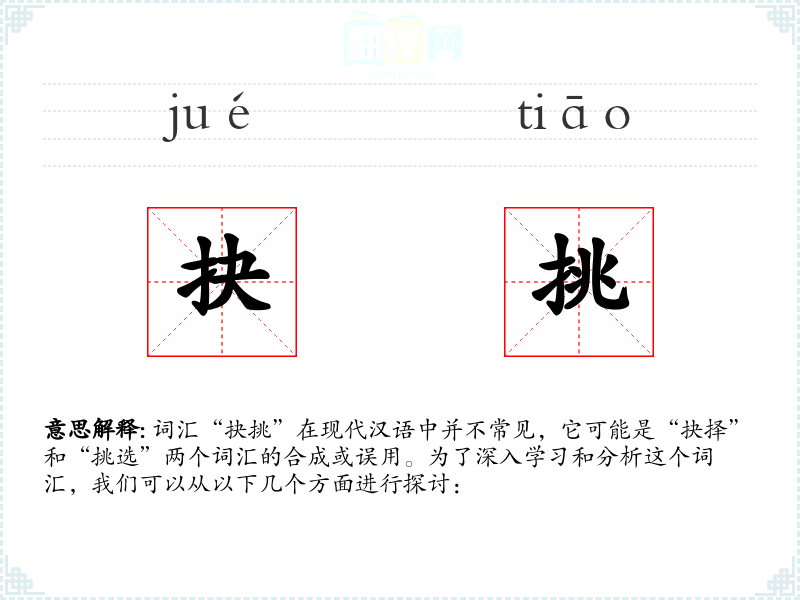 词汇“抉挑”在现代汉语中并不常见,它可能是“抉择”和“挑选”两个词汇的合成或误用。为了深入学习和分析这个词汇,我们可以从以下几个方面进行探讨: