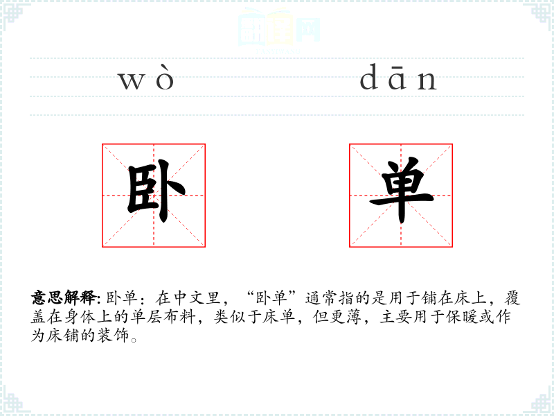 同义词:床单、被单、床罩 反义词:无直接反义词,但可以说“卧单”与“床垫”相对,一个是覆盖物,一个是支撑物。