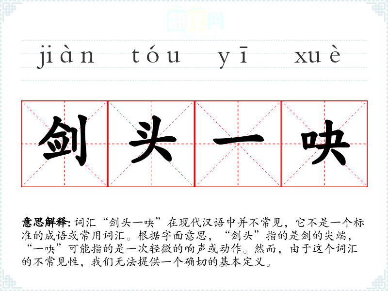 词源与演变: 由于“剑头一吷”不是一个常用词汇,其词源和历史演变不详。它可能是一个古代词汇,随着时间的推移,逐渐被淘汰或遗忘。