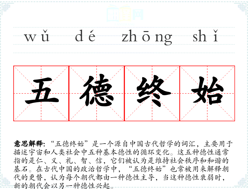 “五德终始”是一个源自古代哲学的词汇,主要用于描述宇宙和人类社会中五种基本德性的循环变化。这五种德性通常指的是仁、义、礼、智、信,它们被认为是维持社会秩序和和谐的基石。在古代的政治哲学中,“五德终始”也常被用来解释朝代的更替,认为每个朝代都由一种德性主导,当这种德性衰弱时,新的朝代会以另一种德性兴起。
