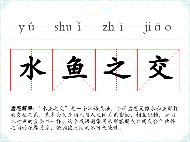 “水鱼之交”是一个汉语成语,字面意思是像水和鱼那样的交往关系。基本含义是指人与人之间关系密切,相互依赖,如同水对鱼的重要性一样。这个成语通常用来形容朋友之间或合作伙伴之间的深厚关系,强调彼此间的不可或缺性。