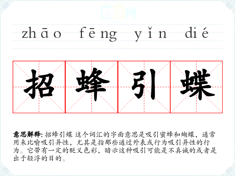 招蜂引蝶 这个词汇的字面意思是吸引蜜蜂和蝴蝶,通常用来比喻吸引异性,尤其是指那些通过外表或行为吸引异性的行为。它带有一定的贬义色彩,暗示这种吸引可能是不真诚的或者是出于轻浮的目的。