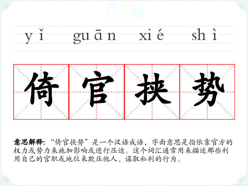 “倚官挟势”是一个汉语成语,字面意思是指依靠官方的权力或势力来施加影响或进行压迫。这个词汇通常用来描述那些利用自己的官职或地位来欺压他人、谋取私利的行为。