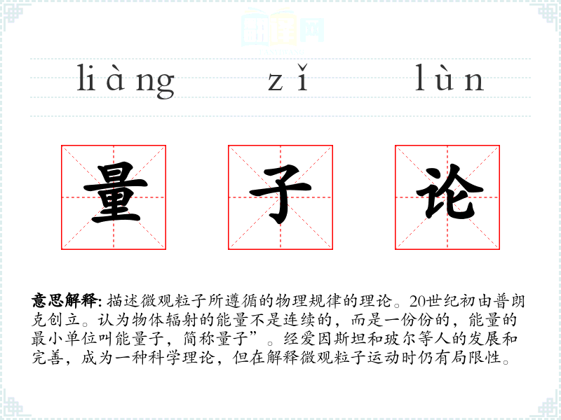 1.描述微观粒子所遵循的物理规律的理论。20世纪初由普朗克创立。认为物体辐射的能量不是连续的,而是一份份的,能量的最小单位叫能量子,简称量子”。经爱因斯坦和玻尔等人的发展和完善,成为一种科学理论,但在解释微观粒子运动时仍有局限性。