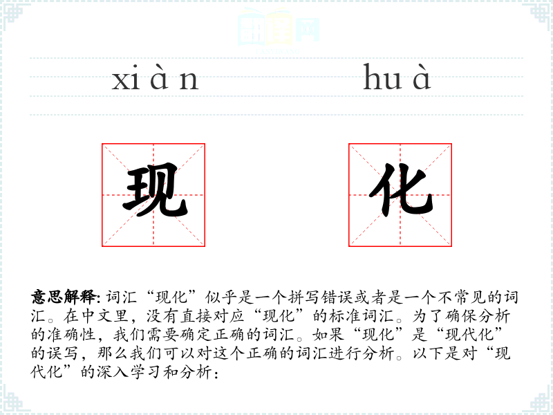 词汇“现化”似乎是一个拼写错误或者是一个不常见的词汇。在中文里,没有直接对应“现化”的标准词汇。为了确保分析的准确性,我们需要确定正确的词汇。如果“现化”是“现代化”的误写,那么我们可以对这个正确的词汇进行分析。以下是对“现代化”的深入学*和分析: