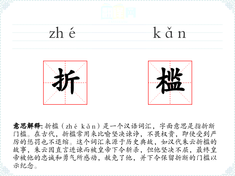 折槛(zhé kǎn)是一个汉语词汇,字面意思是指折断门槛。在古代,折槛常用来比喻坚决谏诤,不畏权贵,即使受到严厉的惩罚也不退缩。这个词汇来源于历史典故,如汉代朱云折槛的故事,朱云因直言进谏而被下令斩杀,但他坚决不屈,最终被他的忠诚和勇气所感动,赦免了他,并下令保留折断的门槛以示纪念。