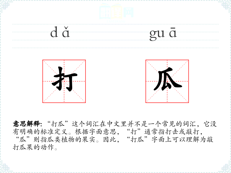 由于“打瓜”不是一个常用词汇,它在不同的语境中可能没有固定的使用方式。在某些方言或特定社群中,可能会有特定的含义,但这需要具体的语境来确定。