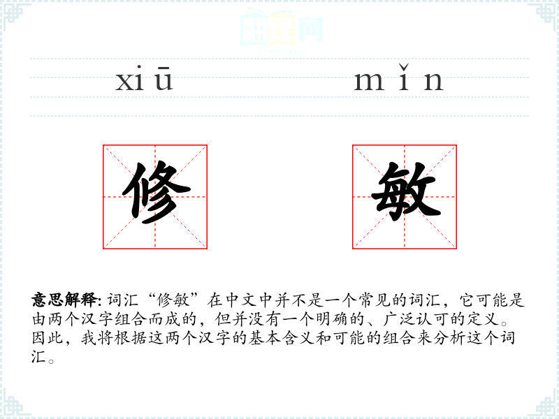 词汇“修敏”在中文中并不是一个常见的词汇,它可能是由两个汉字组合而成的,但并没有一个明确的、广泛认可的定义。因此,我将根据这两个汉字的基本含义和可能的组合来分析这个词汇。