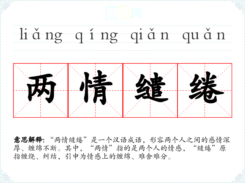 “两情缱绻”是一个汉语成语,形容两个人之间的感情深厚、缠绵不断。其中,“两情”指的是两个人的情感,“缱绻”原指缠绕、纠结,引申为情感上的缠绵、难舍难分。