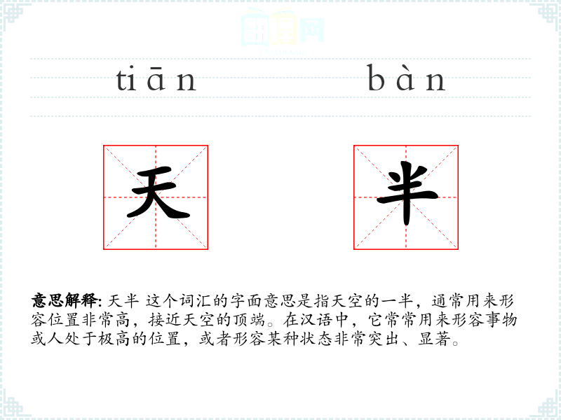 天半 这个词汇的字面意思是指天空的一半,通常用来形容位置非常高,接近天空的顶端。在汉语中,它常常用来形容事物或人处于极高的位置,或者形容某种状态非常突出、显著。