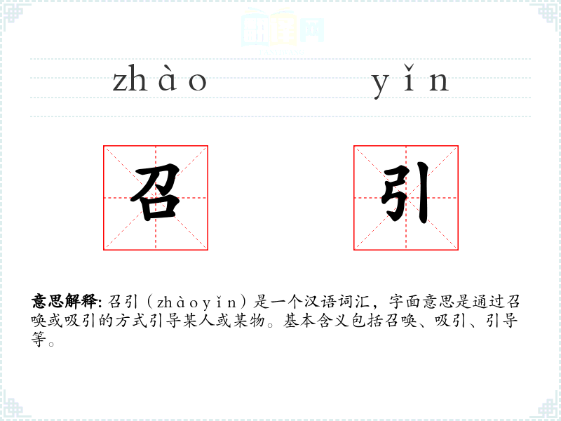召引(zhào yǐn)是一个汉语词汇,字面意思是通过召唤或吸引的方式引导某人或某物。基本含义包括召唤、吸引、引导等。