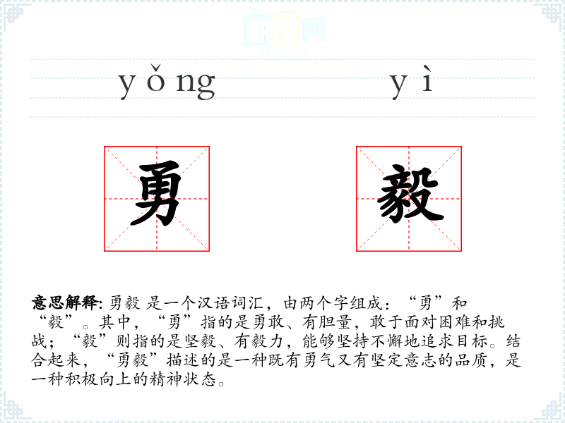 勇毅 是一个汉语词汇,由两个字组成:“勇”和“毅”。其中,“勇”指的是勇敢、有胆量,敢于面对困难和挑战;“毅”则指的是坚毅、有毅力,能够坚持不懈地追求目标。结合起来,“勇毅”描述的是一种既有勇气又有坚定意志的品质,是一种积极向上的精神状态。