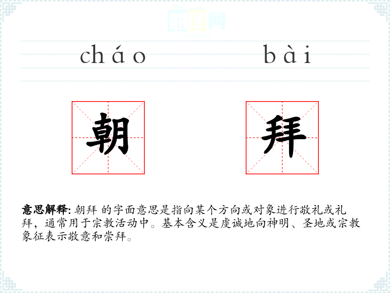 朝拜 的字面意思是指向某个方向或对象进行敬礼或礼拜,通常用于活动中。基本含义是虔诚地向神明、圣地或象征表示敬意和崇拜。