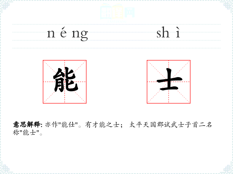 亦作"能仕"。有才能之士; 太平天国郡试武士子首二名称"能士"。